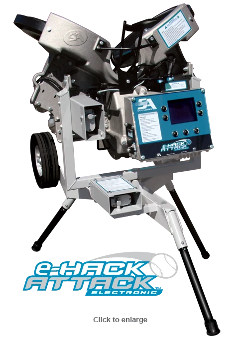 The softball e-Hack Attack is our Programmable pitching machine. In seconds you will be able to dial in any change in speed, location and pitch type to deliver any fastball, riser, drop, right- and left-handed screwball up and into the hitters.
