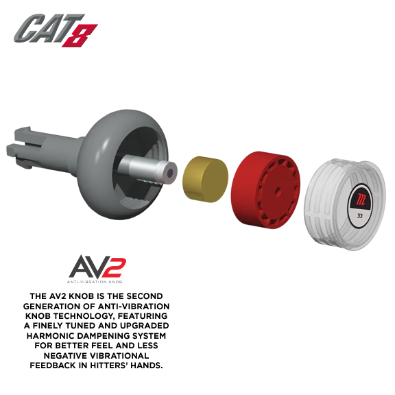 The CAT8 BBCOR is a one-piece alloy bat built with AZ105 super strength aluminum alloy meaning thinner walls, higher response rate, and better durability. The precision-balanced barrel features a ring-free multi-variable wall design that creates an expanded sweet spot, while the patented AV2 Anti-Vibration knob produces a better feel and less negative feedback.